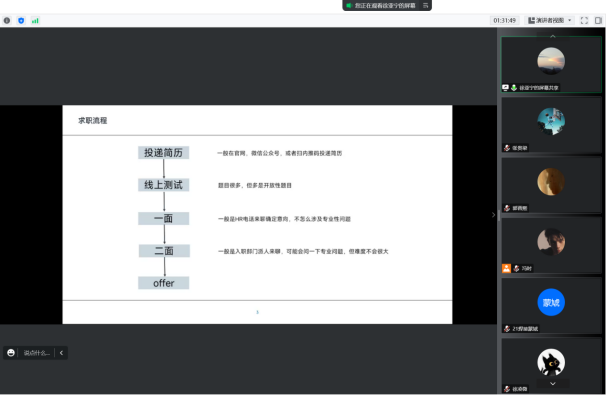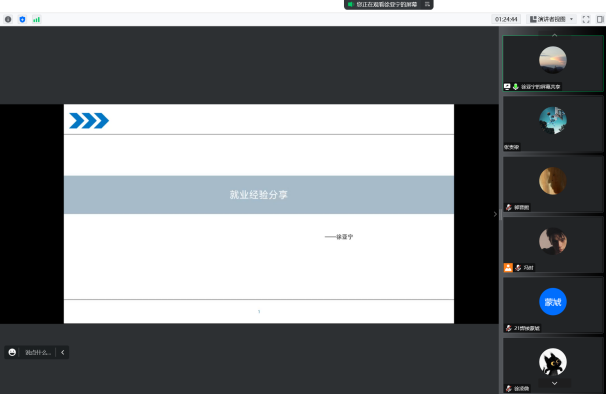 本次分享会邀请了2022届刘鹏、郭晋熙、李振、徐凌微、徐亚宁等五位优秀员工作为分享嘉宾,他们中有的在基层岗位坚守为民服务初心、有的在国企私企支撑大国“智造”伟业,有的在海外留学不断追求学术造诣。在分享会上他们紧紧围绕就业和出国留学等主题向学弟学妹们分享求职经验与工作心得,并耐心给提问者答疑解惑。