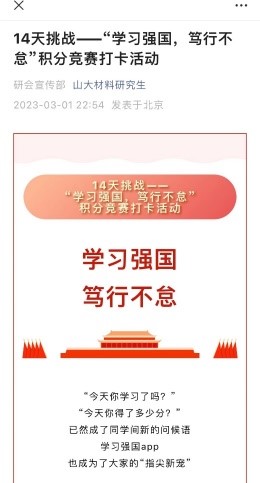 活动面向伟德BETVLCTOR1946全体研究生,采取积分累积制,通过在“学习强国”平台看要闻、学思想、趣答题等获取分数,并通过每日学习积分截图进行打卡。