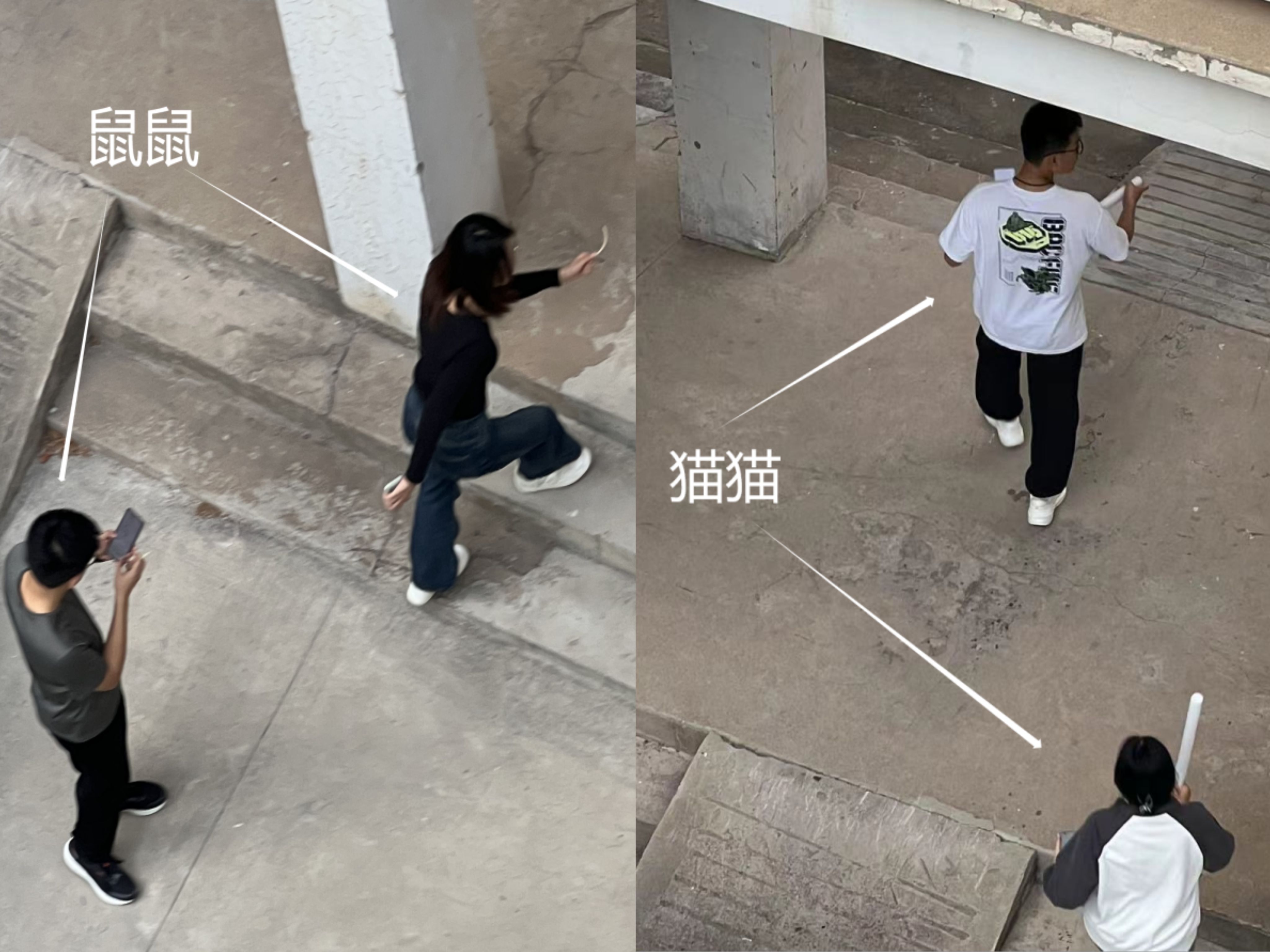 游戏以“猫捉老鼠”的故事情节为背景,随着发起人一声哨响,大家纷纷进入地图中。猫队伍跃跃欲试准备抓捕,鼠队伍也开始寻找隐藏点,追逐大战一触即发。游戏过程中,汤姆猫队伍看着地图上杰瑞鼠队伍的头像,纷纷摩拳擦掌跃跃欲试,而杰瑞鼠队伍的成员们也不甘示弱。一些大胆的杰瑞鼠成员躲在一片漆黑的花丛中,被“视觉敏感”的汤姆猫抓捕俘获。还有一些杰瑞鼠玩起了角色扮演,混迹在操场中正在跑步的队伍中。大家在操场中快乐地奔跑,欢呼声和尖叫声不断。在追逐和躲避中,活动逐渐迎来了尾声,最终赢得荧光手环最多的为“猫王”,躲到最后的则为“鼠王”。