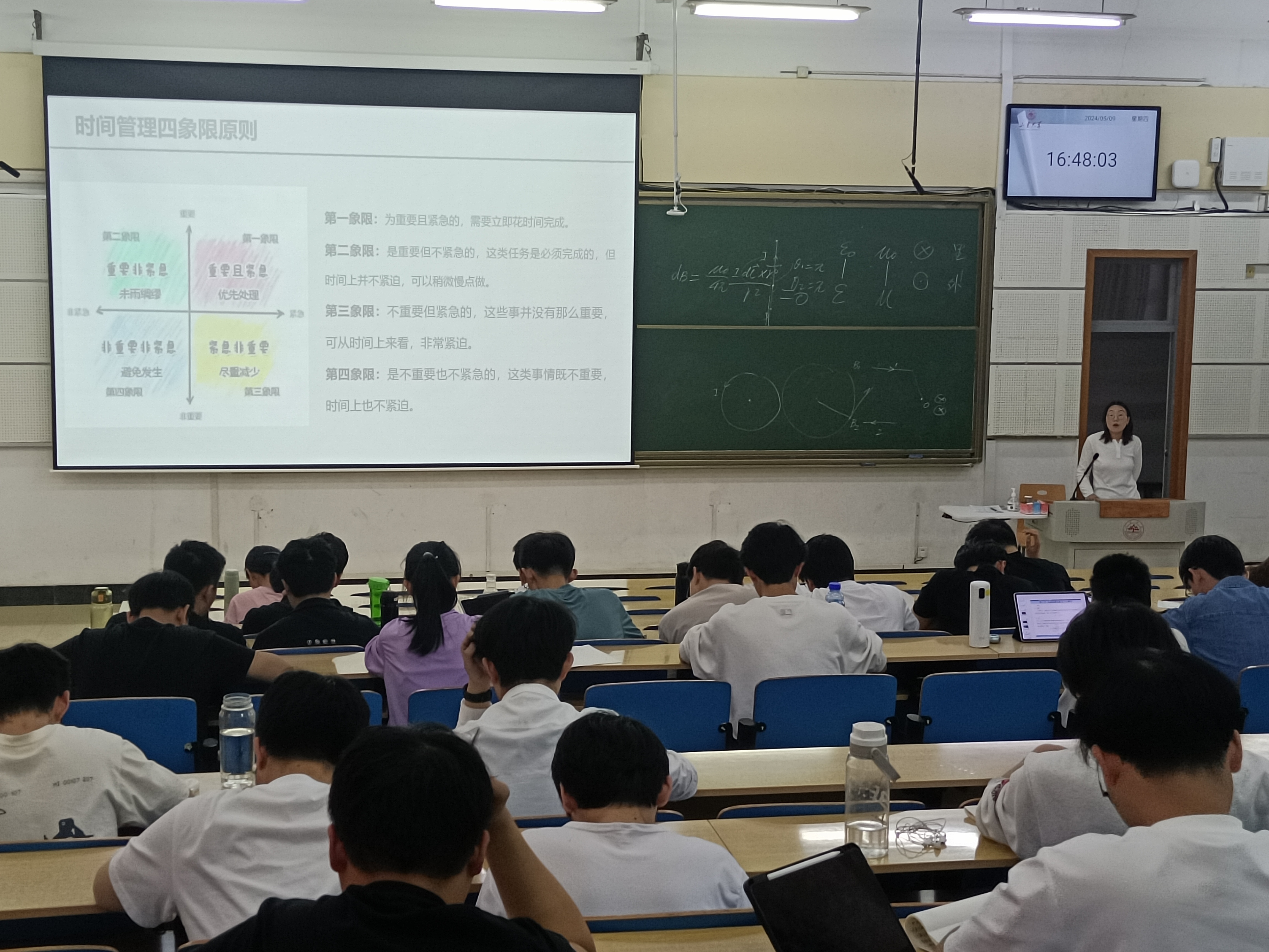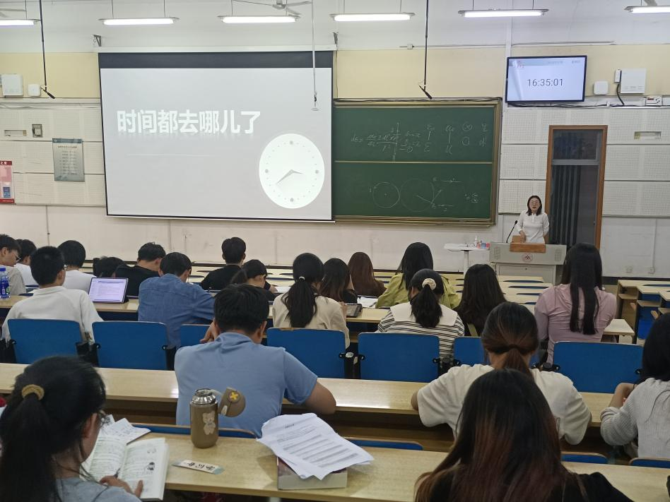 王兴兴以“撕一撕我们的时间”游戏引入,带领同学们了解自身的时间分配和利用情况,进一步理清时间管理的定义,指导大家通过事先规划和运用一定的技巧方法,实现对时间的灵活有效运用,从而实现既定目标。随后,她围绕时间管理四象限法则与同学们交流,引导大家从事情的紧急和重要程度出发,合理规划时间,学会统筹兼顾,充实有序地度过大学时光。最后,她向同学们介绍了小睡眠、如斯、iHour、时光序等几个时间管理APP,鼓励大家结合自身实际情况,选择适合自己的软件,提高规划性、自律性,有条不紊地安排自己的生活。