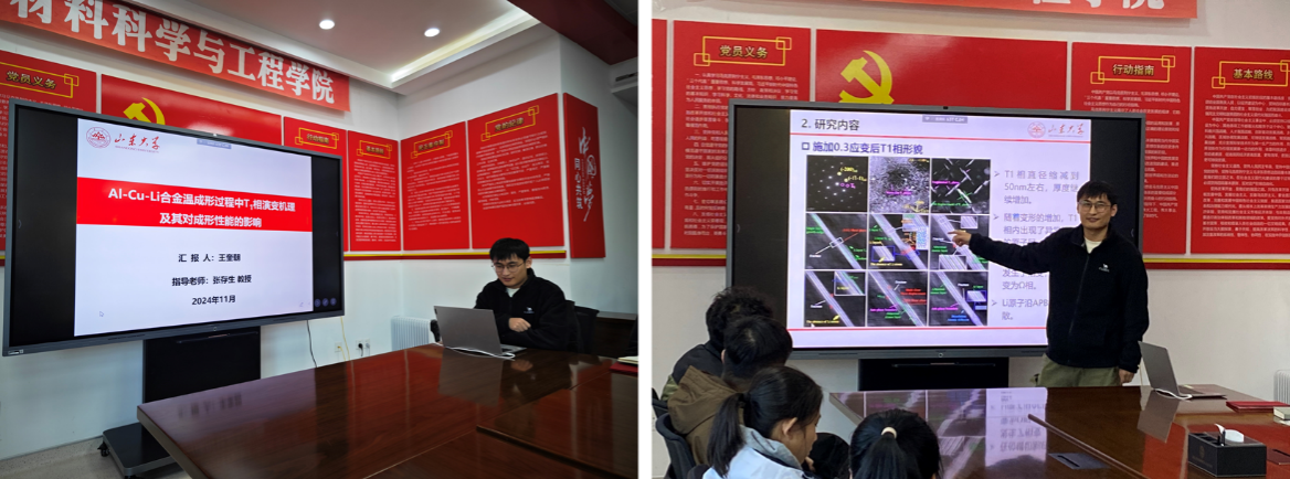 王奎朝进行了题为“铝锂合金温热变形过程中T1相的动态演变规律研究”的学术分享。首先,他介绍了铝锂合金的微观组织及析出相,指出T1相作为铝锂合金中密度最高、对强度贡献最大的微纳特征,其形貌与尺寸分布对合金的微观组织演变和热加工性能具有不可忽视的影响。然而,在热变形过程中复杂的热力耦合作用下,T1相的状态、密度和尺寸分布复杂多变,导致合金成形精度和成形后的组织和性能难以控制。因此,探究T1相温热成形过程中的演变规律,建立其对合金组织性能的影响关系,是实现铝锂合金温热成形过程中形性协调控制的关键。王奎朝通过预热处理和热压缩变形相结合,探究了T1相温热成形过程中的演变规律,并揭示了其对合金组织性能的影响,实现了铝锂合金温热成形的形性协调控制。