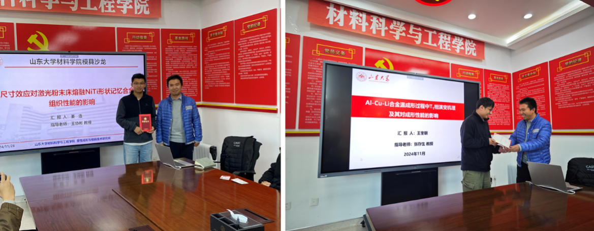 本次学术沙龙中让同学们对激光粉末床熔融NiTi形状记忆合金的性能调控、铝锂合金温热变形过程中T1相的动态演变规律有了一个整体的认识,激发了大家科研求知的热情。最后,陈孝学为主讲人颁发了模具沙龙奖状和纪念品,并合影留念。