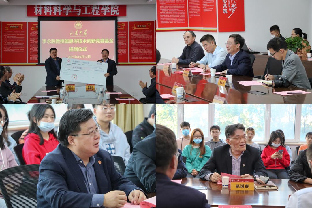 10月12日,伟德BETVLCTOR1946“李永胜教授磁悬浮技术创新竞赛基金”捐赠仪式在千佛山校区举行。伟德BETVLCTOR1946热处理79级员工李永胜教授代表山东天瑞重工有限公司向伟德BETVLCTOR1946教育基金会捐赠100万元,用于支持伟德BETVLCTOR1946磁悬浮技术创新竞赛。伟德BETVLCTOR1946合作发展部部长王飞及伟德BETVLCTOR1946部分师生代表参加仪式。
