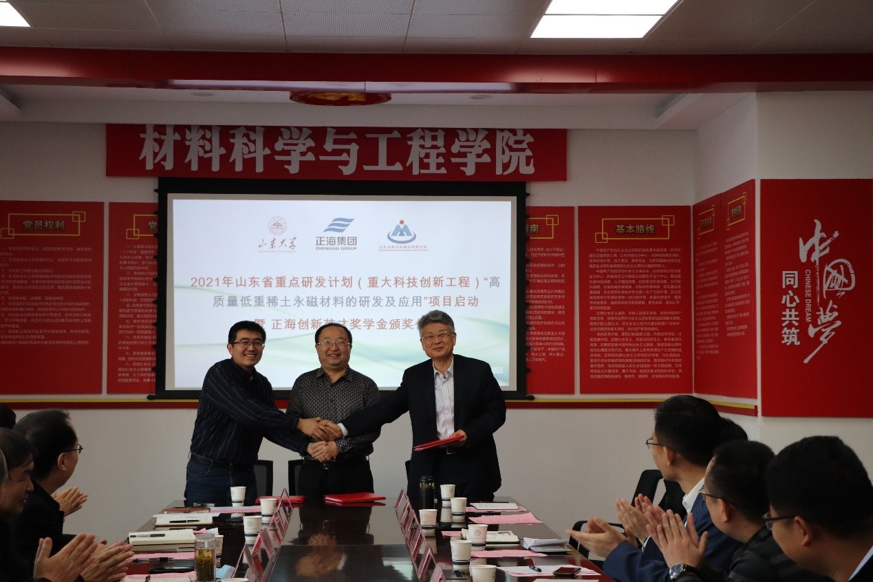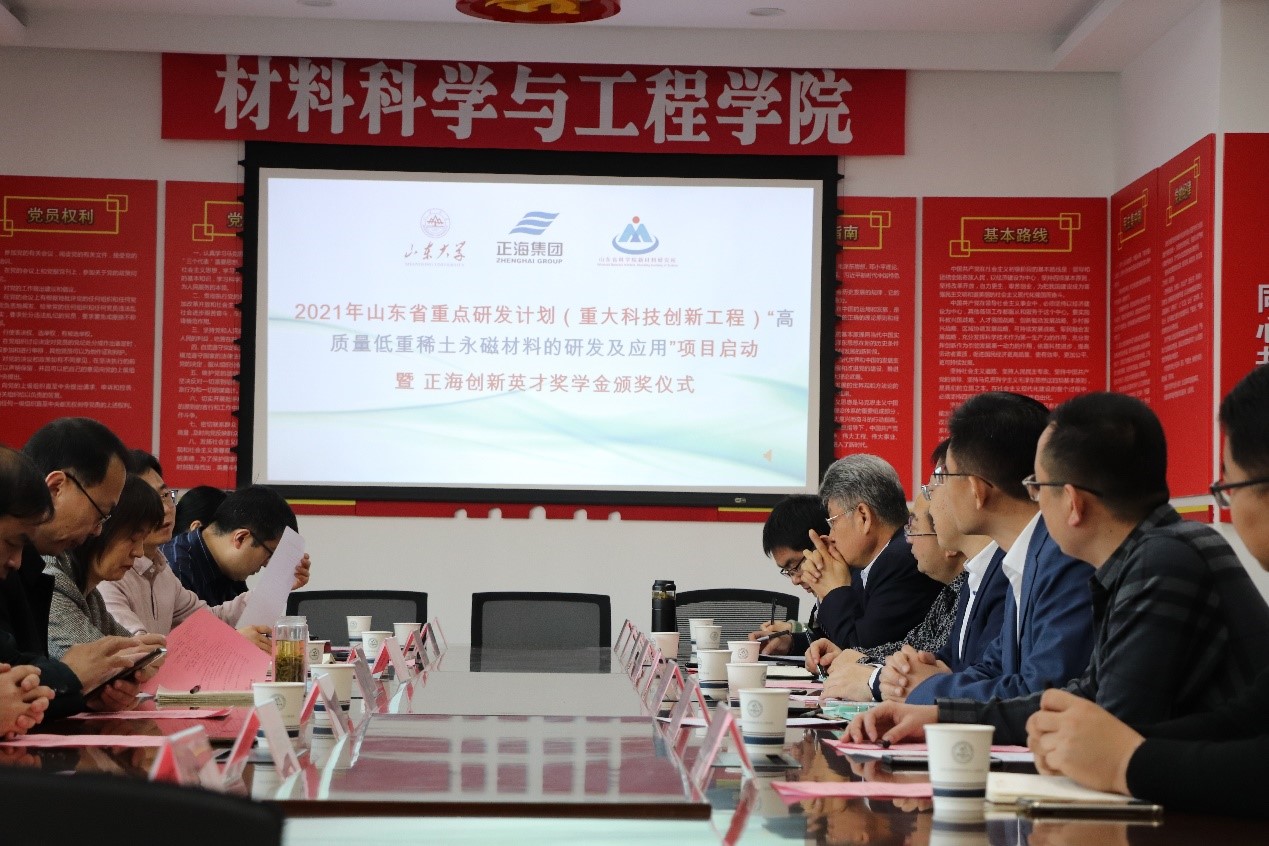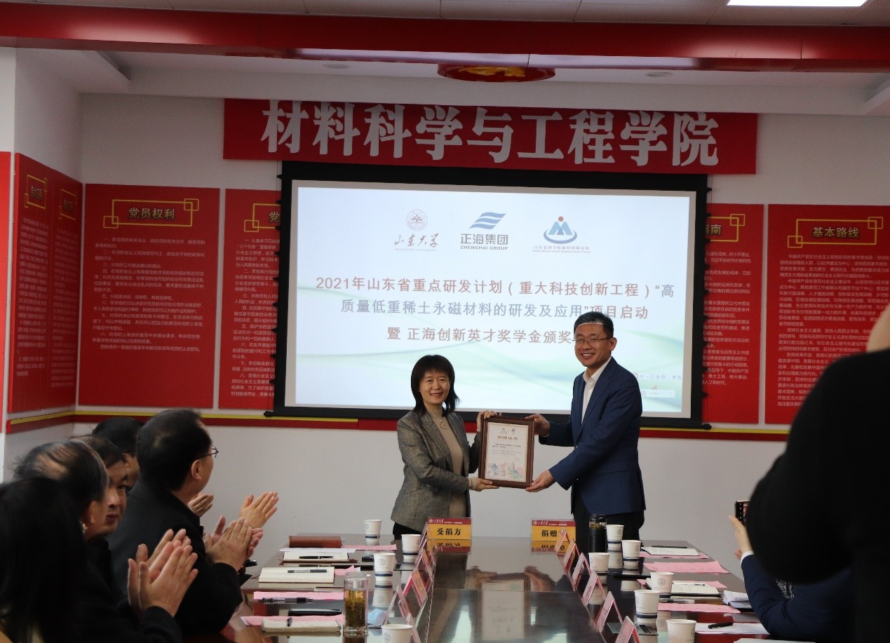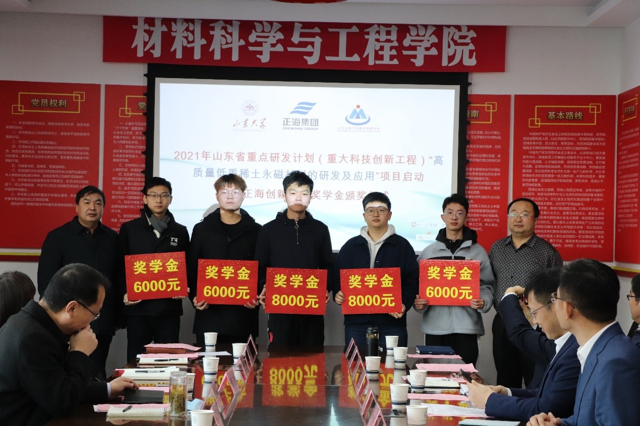 12月21日,山东省重大科技创新工程项目“高质量低重稀土永磁材料的研发与应用”启动暨正海创新英才奖学金颁奖仪式在千佛山校区主楼二层党员之家举办,仪式由公司党委副书记董兴主持,正海集团、山东省科学院新材料研究所、伟德BETVLCTOR1946教育基金会、伟德BETVLCTOR1946、物理学院、机械学院相关领导及15名奖学金获得者等出席仪式。