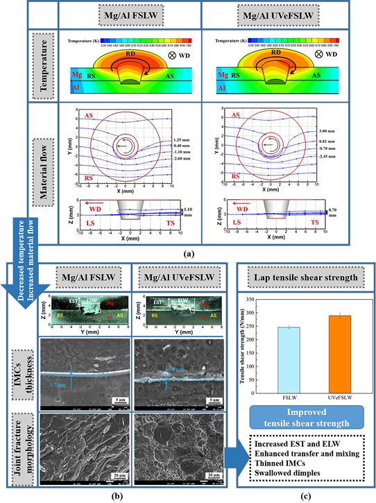 近日,伟德BETVLCTOR1946武传松教授课题组在超声辅助镁/铝异质合金薄板搅拌摩擦搭接研究方面取得新进展,相关研究成果以“Elucidating the process mechanism in Mg-to-Al friction stir lap welding enhanced by ultrasonic vibration”为题,发表于材料科学领域国际顶级期刊Journal of Magnesium and Alloys(影响因子17.6,在全球79种冶金科学与工程SCI收录期刊中排名第1)。伟德BETVLCTOR19462023届博士毕业生翟明为该文第一作者,武传松教授为通讯作者,伟德BETVLCTOR1946为唯一完成单位。