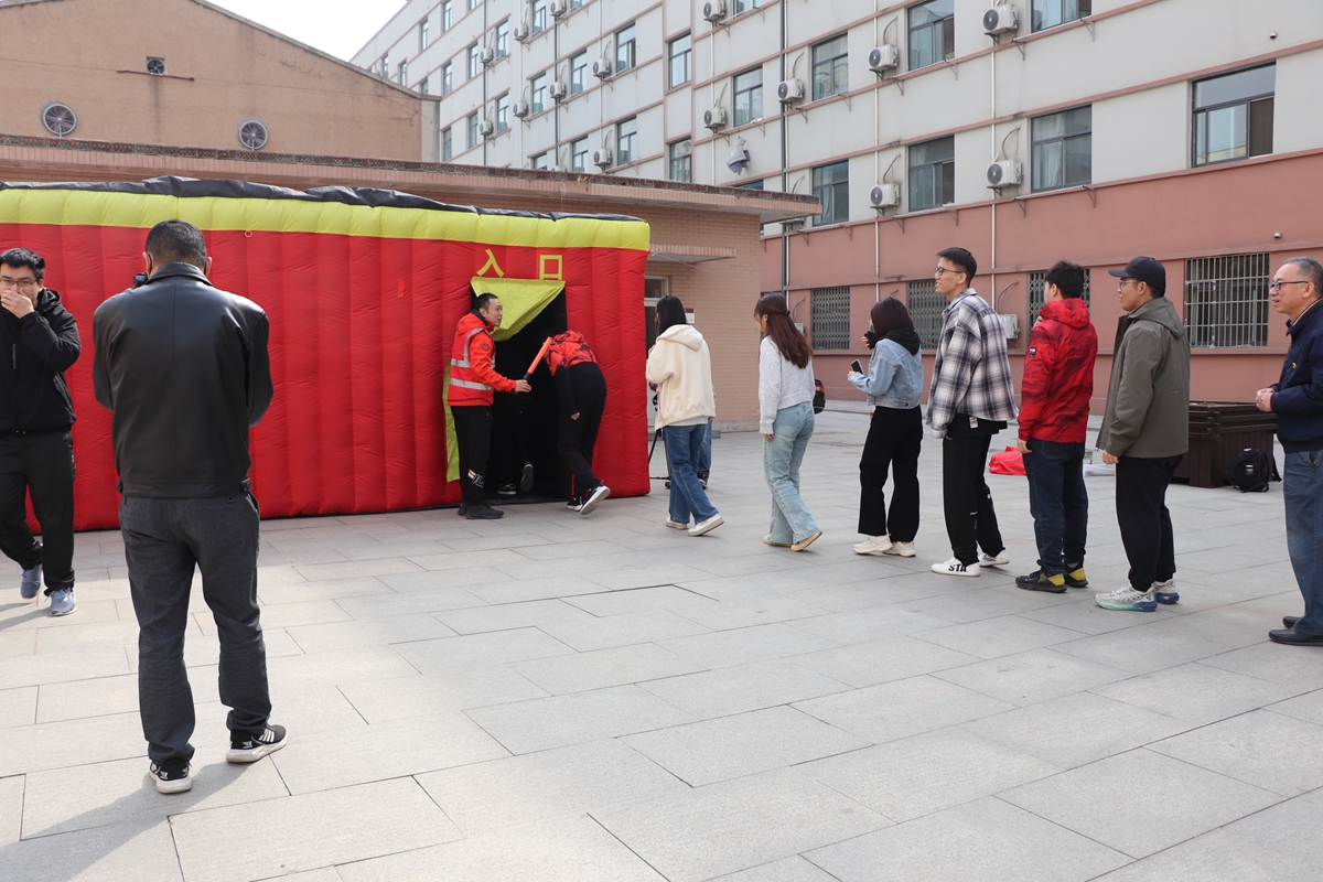 讲座结束后,学院组织师生前往户外火场逃生演练现场,在搭设的帐篷内,师生有序体验了模拟电子烟雾的火灾现场的逃生过程。现场师生纷纷表示这场生动的讲座切实提高了自身对于消防安全的认识,以及对常用灭火器的认识,进一步增强对消防安全的关注与了解,提高消防安全意识以及遇到火灾时的自救自护能力,为平安校园的共建、共治与共享贡献力量。