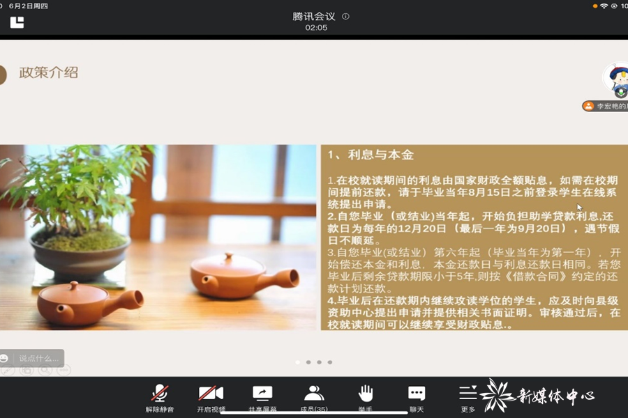会议伊始,李宏艳同学分别从利息和本金、利率及利率调整和征信知识三个方面对同学们进行了相关政策的详细介绍通过李宏艳的介绍,同学们相关政策信息有了更为充分和科学的了解同时也对信用助学贷款有更深的认识。随后,李宏艳又为同学们讲解了还款流程及还款方式,包括正常还款、提前还款和逾期还款三种情况的处理方式在这一基础上,李宏艳还解答了部分同学的疑问有效保证各贷款生还款工作的顺利完成。接着,李宏艳提醒同学们,离校前需要办理毕业确认手续,保证贷款生毕业流程顺利进行并未大家补充了几点小贴士,解答了贷款生在还款过程中的常见问题。