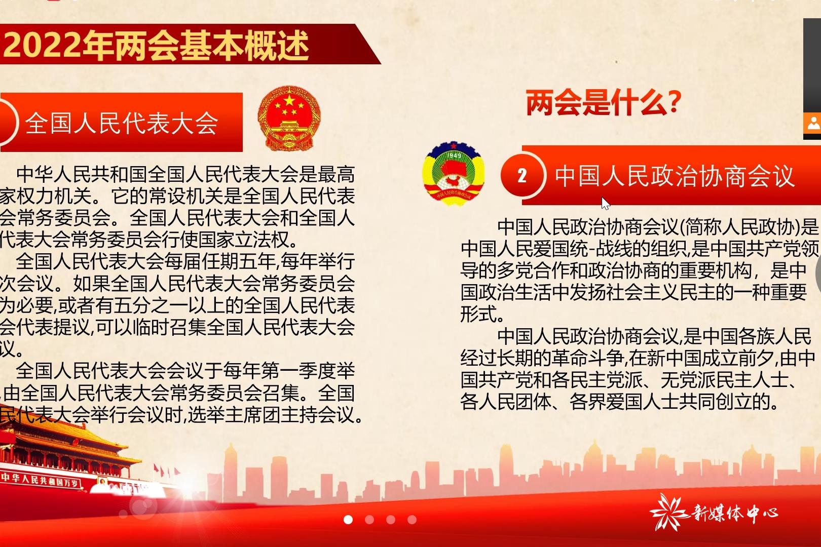 会议伊始,杨函首先介绍了本次会议的主要内容,主要包括两会基本概述、政府工作报告、两会热点解读、我们能做什么四个方面。杨函从两会基本概述讲起,向同学们介绍了全国人民代表大会和中国人民政治协商会议。接下来,杨函重点介绍了政府工作报告中的2022年部分重点工作,涵盖财政、政府投资、减税、就业、政务服务、消费、创新、乡村振兴、开放、环保、教育、医保、社会保障、住房、文体、港澳台问题等,涉及人民衣食住行方方面面。