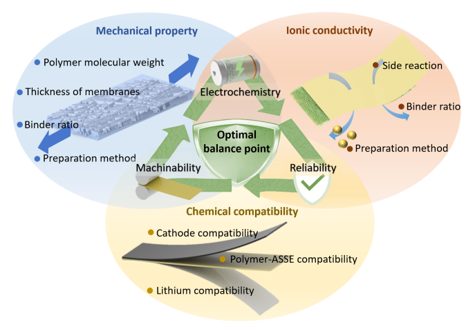 全固态锂电池(ASSLBs)因其高能量密度和高安全的特性而备受关注。基于粉末冷等静压技术,实验室级单轴加压全固态锂电池往往极大牺牲整体能量密度,且成本较高。因此,制备超薄固态电解质膜是实现商业化高能量密度全固态锂电池的关键途径。硫银锗矿型固态电解质(ASSEs)由于其高室温离子电导率和优异的机械加工性能有望与聚合物耦合以提升整体柔韧性和成膜性。然而,ASSE薄膜以及在高能量密度全固态软包电池的应用仍远未实现商业化,其中聚合物的选择、聚合物、ASSE 和电极的化学稳定性/相容性、膜的机械性能和电化学性能之间的权衡以及统一的评估标准是有待解决的关键科学问题。团队聚焦于目前对ASSE膜的基础认知、构建策略和发展机遇,从ASSEs的基本原理入手,讨论了其失效机制和电化学性能,着重总结了 ASSE 膜的设计策略和相应的制备方法,包括单聚合物支撑和新型聚合物共构建方面的进展。由于聚合物的引入增加了化学复杂性,团队全面评估了聚合物对ASSE膜物理化学性质的影响以及潜在应用场景。同时,提出了固态电解质薄膜评估标准并总结固态电解质薄膜的关键影响因素。最后,指明了未来固态电解质薄膜设计和商业化的发展方向。伟德BETVLCTOR1946为论文完成第一单位,伟德BETVLCTOR194622级基地班本科生严毅杰为第一作者,通讯作者来自伟德BETVLCTOR1946尹龙卫教授、王儒涛教授、张树贤博士以及国网江苏省电力有限公司电力科学研究院肖鹏高级工程师。