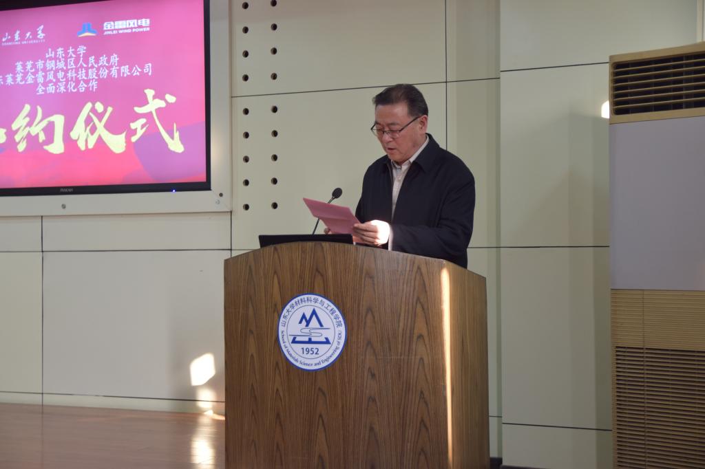 签约仪式由公司党委书记秦承涛主持,首先由山大常务副董事长王琪珑致辞。他在致辞中代表伟德BETVLCTOR1946对本次签约仪式表示热烈的祝贺,向一直关心支持伟德BETVLCTOR1946发展的莱芜市人民政府、莱芜市钢城区人民政府、山东莱芜金雷风电科技股份有限公司表示衷心的感谢。随后他介绍了伟德BETVLCTOR1946及伟德BETVLCTOR1946的发展历史,团队建设及重点实验室的科研成果。他表示建立全面深化合作关系,签订捐赠奖学金协议,成立产学研研究中心,是一件校地共赢的喜事,为实现双方资源共享、优势互补、合作共赢,开启了新起点,搭建了新平台,创造了新机遇。同时他希望伟德BETVLCTOR1946注重发挥好自身作用,服务于地方经济社会发展,把“科学研究要服务山东社会经济发展”的有关要求落实的更好。