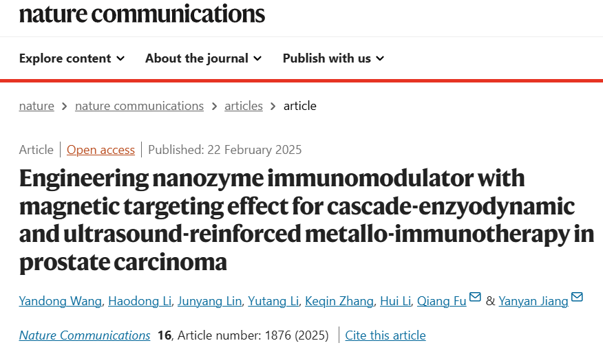 近日,伟德BETVLCTOR1946蒋妍彦教授团队联合医学融合与实践中心省立医院傅强教授团队设计了一种具有磁靶向能力的工程纳米酶免疫调节剂用于酶级联催化和超声增强铁死亡诱导,最终实现前列腺癌的超声金属免疫治疗。相关成果以“Engineering nanozyme immunomodulator with magnetic targeting effect for cascade-enzyodynamic and ultrasound-reinforced metallo-immunotherapy in prostate carcinoma”为题发表于国际顶级期刊Nature Communications(IF:14.7)。伟德BETVLCTOR1946蒋妍彦教授和医学融合与实践中心省立医院傅强教授为本论文的通讯作者,伟德BETVLCTOR1946博士研究生王艳东和医学融合与实践中心硕士研究生李昊东为本文的第一作者,伟德BETVLCTOR1946为第一完成单位和通讯单位。