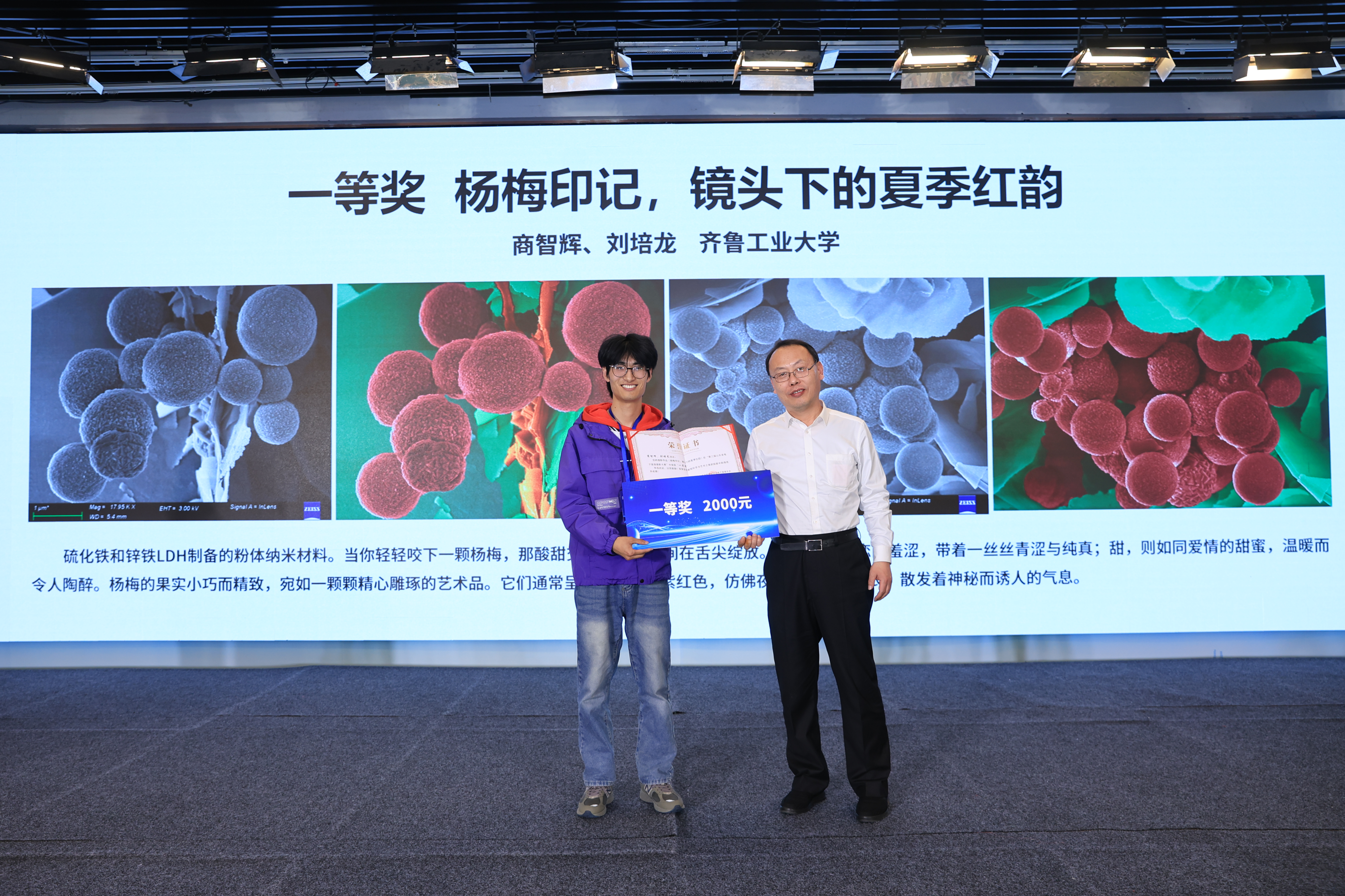 作为活动亮点,第三届山东省电子显微摄影大赛颁奖典礼备受瞩目。本次大赛共收到六十余幅参赛作品,经专家评审,来自齐鲁工业大学商智辉、刘培龙的《杨梅印记,镜头下的夏季红韵》凭借其独特的艺术视角与科学内涵摘得一等奖。作品通过电子显微镜捕捉植物微观结构,将科学图像的理性之美与自然生命的诗意表达完美融合,展现了科学与艺术碰撞的独特魅力。