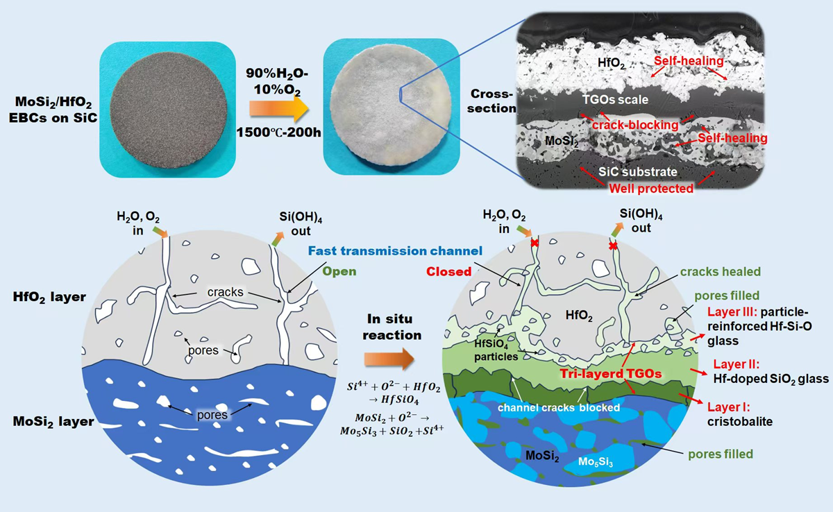 碳化硅陶瓷基复合材料(SiC-CMC)具有更轻的质量、更好的耐温能力、良好的高温强度和韧性,有望应用于下一代航空发动机热端部件。由于SiC在高温燃气环境中并不稳定,解决其腐蚀问题显得尤为关键,实际应用中需在SiC-CMC表面制备环境障涂层(EBCs)。现有涂层材料体系无法满足在更高温度燃气环境中的应用需求。韩桂芳教授课题组首次开发了MoSi2/HfO2复式EBCs,通过在涂层内部原位生成的三层热生长氧化物(TGO),有效阻挡了高温燃气中的水蒸气、氧气等向SiC基体的扩散,在1500℃、90%H2O-10%O2环境中有效保护SiC长达200小时。这项工作提供了一种新的策略,可以同时提高TGO的稳定性和EBCs的工作温度,这有助于开发具有更长使用寿命和更高使用温度的新一代EBCs体系。