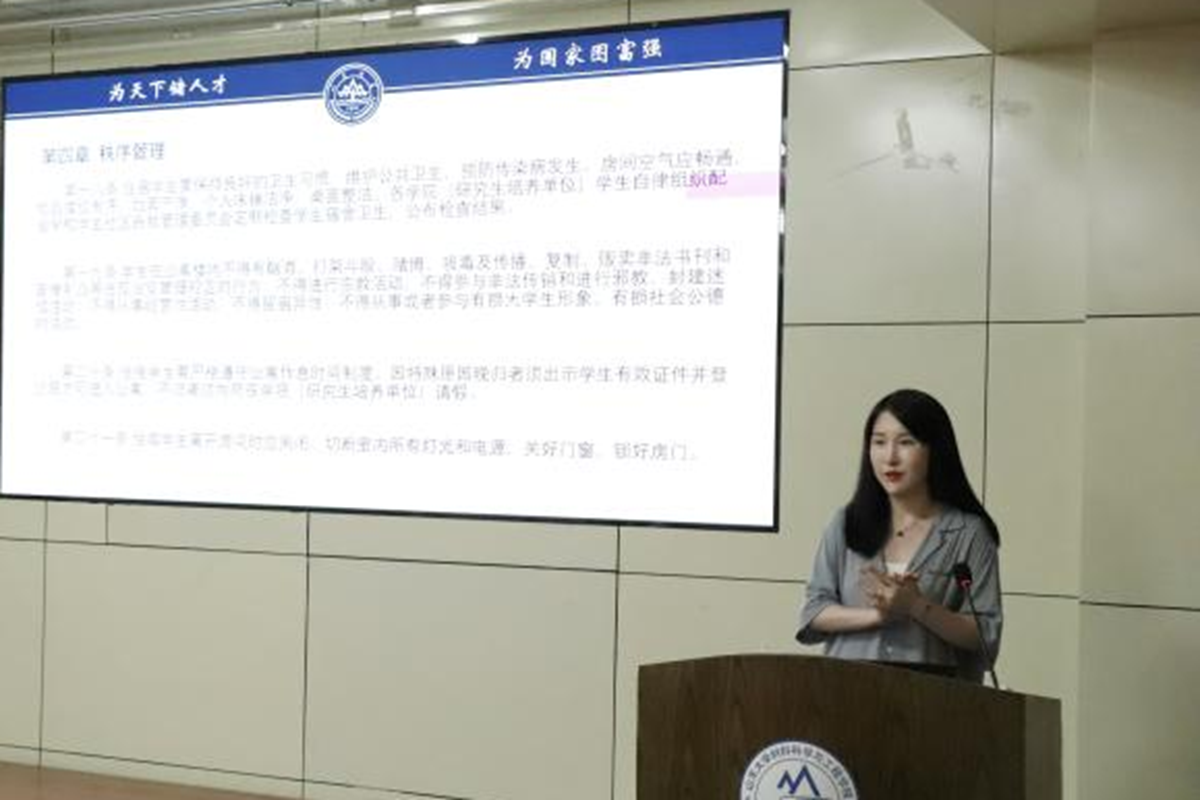 规范员工请销假制度,强化员工日常管理为增强同学们的纪律意识,辅导员刘梦瑶在各班开展行为规范教育,带领同学们学习《研究生手册》,突出强调宿舍安全、交通安全等内容,进一步增强同学们对校规校纪和校园生活的理解。