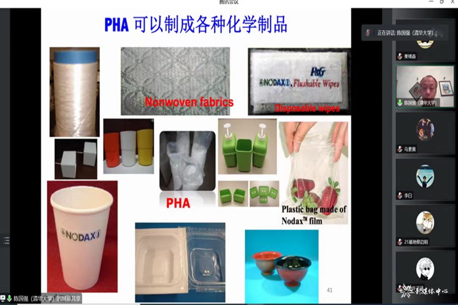 会议伊始,陈国强介绍了当前化工与生物制造的优缺点,为克服微生物底盘易受污染问题,结合当前社会上所倡导的绿色可持续发展材料,向同学们介绍了极端微生物底盘的相关内容。教授陈国强指出,目前可以通过在极端环境下仍然可以生存的嗜盐菌生产可降解的PHA塑料,相关研究也表明PHA在鱼类体内全部分解,是一种环境友好型产品,可用于替代当前的普通塑料缓解环境污染,现在也在研究PHA的规模化量化生产。在量化生产过程中,陈国强遇到了许多问题,会议上就其中的菌类繁殖速度问题向同学进行了详细讲述。