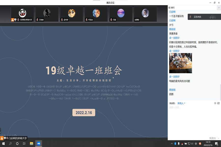 在大家的分享结束以后,班会的第二个环节开始。在这一环节,石磊对同学们的生活分享进行总结,并对寒假剩余的这几天的安排做出几点要求。临近开学,同学们都已经开始准备春季学期的返校工作;石磊希望同学们能够在最后的这一周时间里,调整好状态,调节心情,并能够在周末顺利返校。此外,由于近期个别地区又出现病例,因此他也希望同学们注意最后这几天的自我防控,听从防疫部门的安排,避免不必要的麻烦。考虑到同学们即将面临升学与就业,石磊也要求同学们能够抓紧时间,对接下来的学习生活做好规划。最后,路丽丽对本次班会做总结,希望大家做好疫情防控,顺利平安返校,开学后努力奋进。
